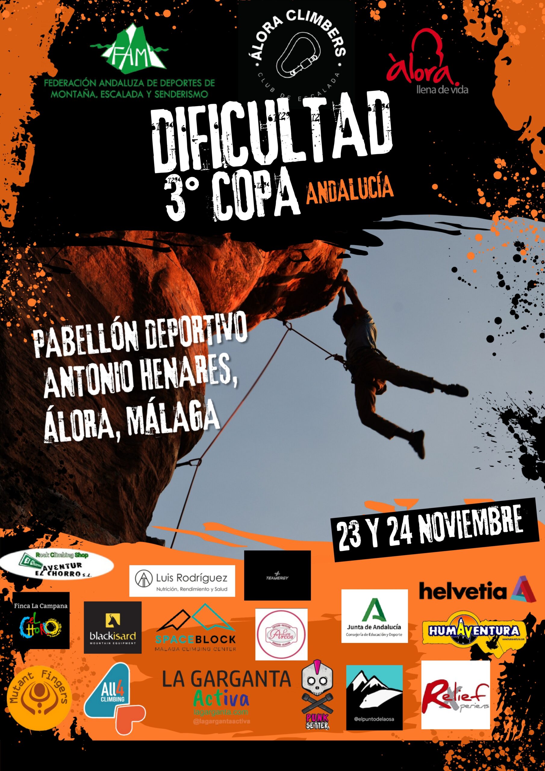 La Federación Andaluza de Deportes de Montaña, Escalada y Senderismo (FADMES), junto con el Club Escalada Álora Climbers y el Ayuntamiento del municipio malagueño organizan la tercera y última prueba de la Copa de Andalucía de Escalada de Dificultad, competición que tendrá lugar este sábado 23 y domingo 24 de noviembre en el Pabellón Municipal Antonio Henares.