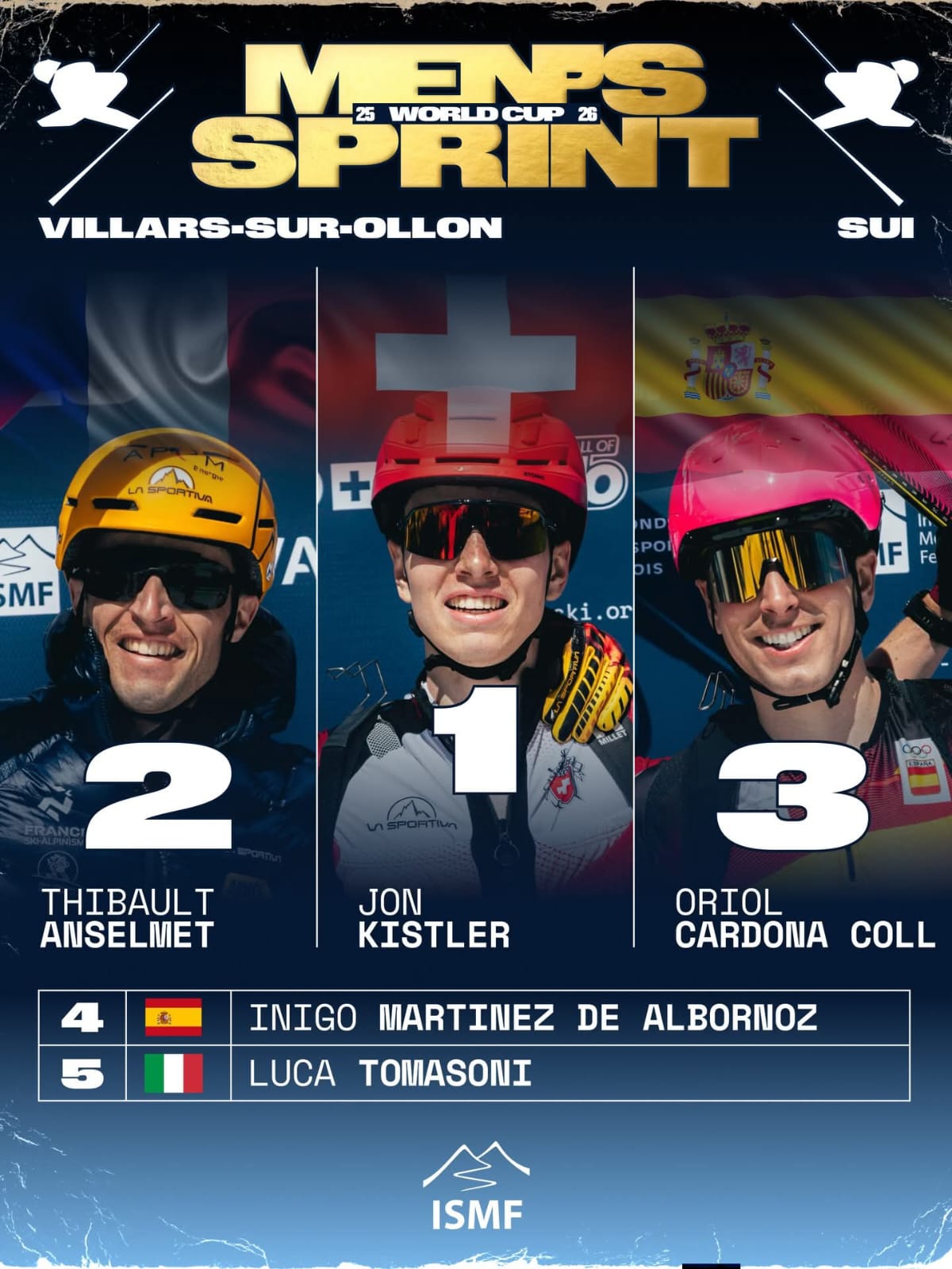 En la final masculina con doble participación española por medio del campeón olímpico Oriol Cardona e Íñigo Martínez de Albornoz, el triunfo ha sido para el local Jon Kistler (02:32.8), con Anselmet a un segundo (02:33.8) y Oriol Cardona (02:42.8) en tercera posición cuando justo en la última transición había recuperado sus opciones al triunfo, pero un enganchón de las pieles le impidió lanzarse al último descenso junto al suizo y al francés. Incluso Íñigo Martínez de Albornoz (02:42.9) estuvo casi en opción de conseguir arrebatarle el bronce por una sola décima.
