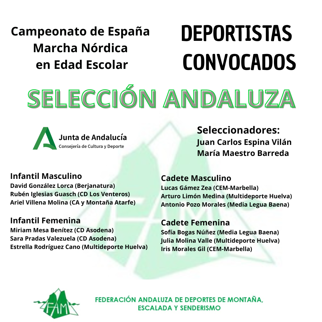 La Federación Andaluza de Deportes de Montaña, Escalada y Senderismo (FADMES) da a conocer la convocatoria de los deportistas seleccionados para el próximo Campeonato de España en Edad Escolar de Marcha Nórdica. Una convocatoria que forman 12 componentes, seis niños y seis niñas.