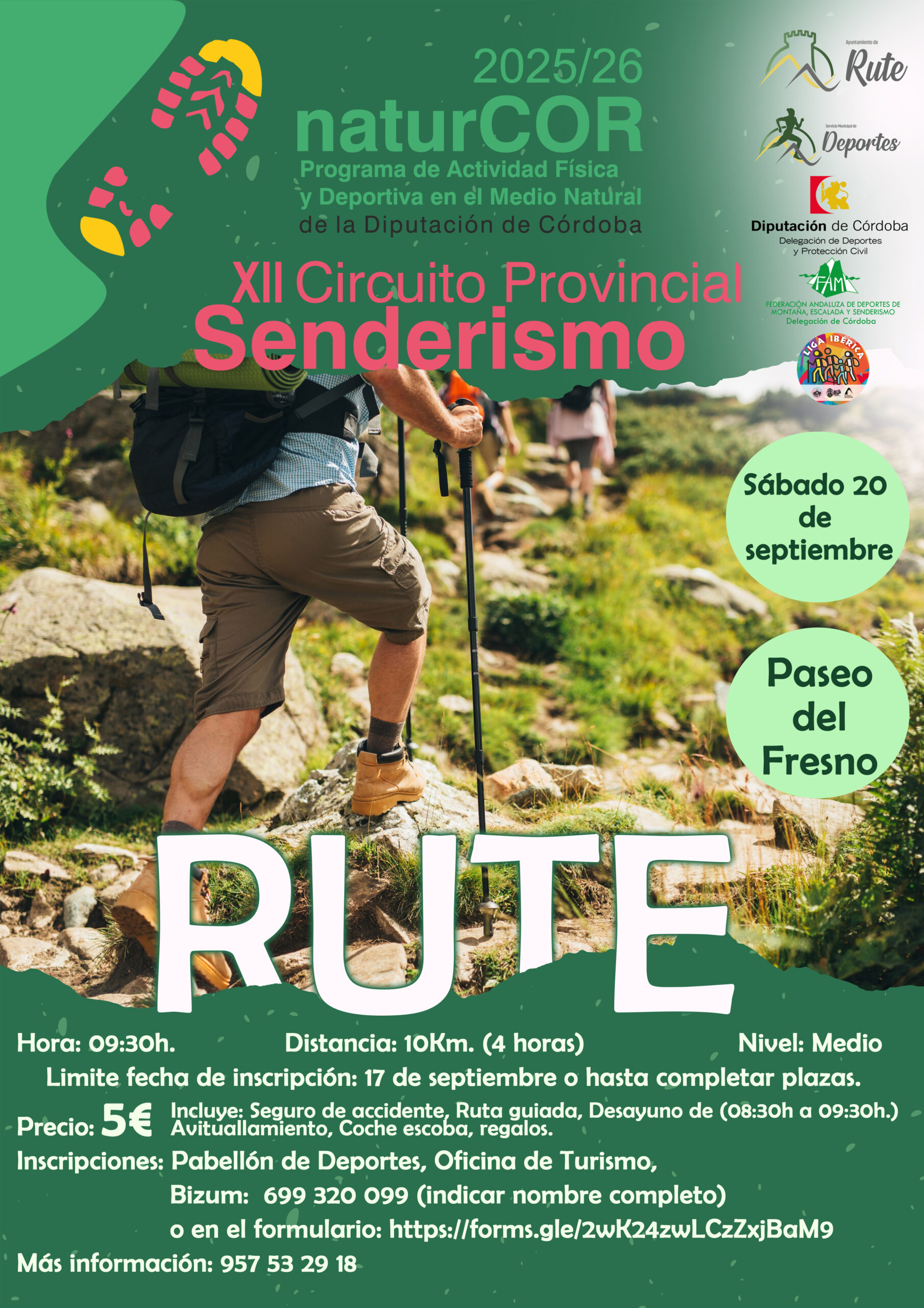 El sábado 20 de septiembre, dentro del XII Circuito Provincial de Senderismo del programa de actividades física y deportivas en el medio natural naturCOR, promovido por la de la Diputación de Córdoba junto con la Federación Andaluza de Deportes de Montaña, Escalada y Senderismo y la organización por el Ayuntamiento de Rute, se celebrará la sexta prueba de esta duodécima edición.