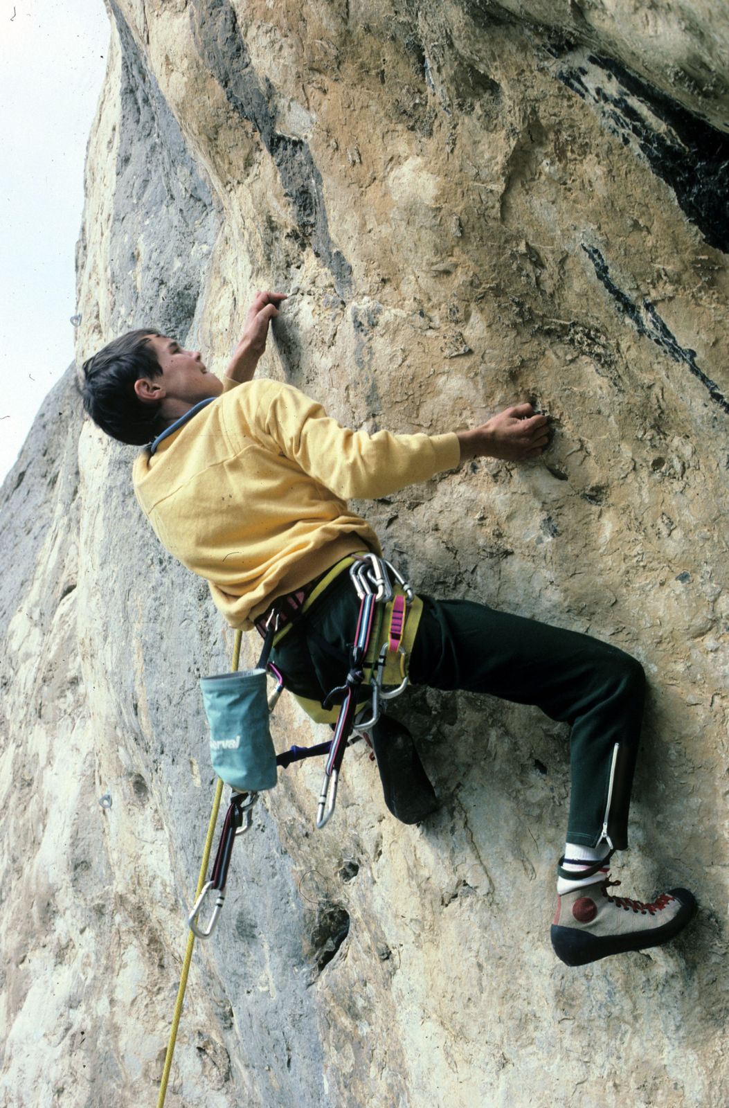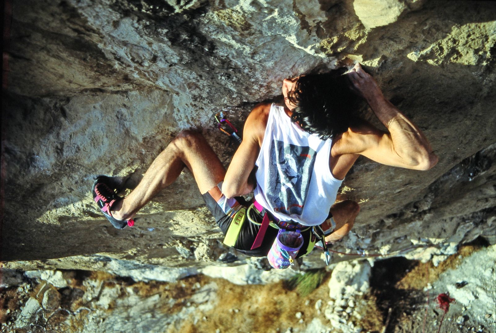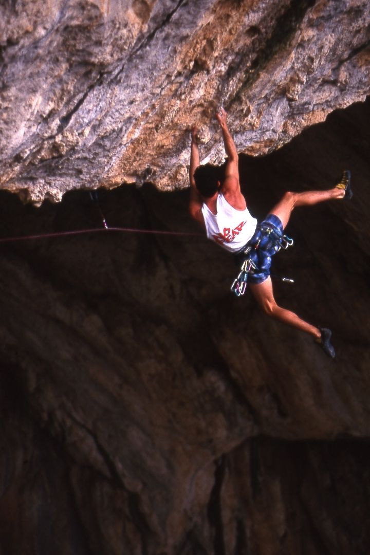 En aquellos años, las lluvias de invierno eran más intensas y la pared quedaba completamente empapada; el agua caía por las estalactitas como si fueran grifos abiertos, así que solo podía probar la vía de mayo a octubre. Durante el resto del año, entrenaba incansablemente para estar preparado. Los días que podía escalar eran apenas dos por semana, ya que el trabajo no me permitía más, y las vacaciones las aprovechaba exclusivamente para ir también a la vía en las fechas adecuadas.