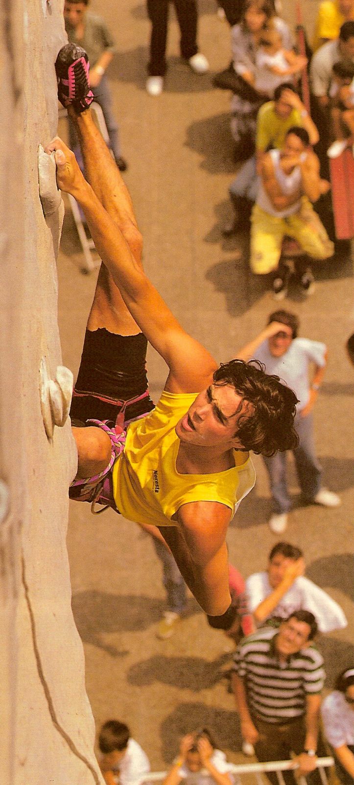 La primera competición internacional que se celebró en Europa tuvo lugar en 1985 en Bardonecchia. Las primeras pruebas de la Copa del Mundo de cuerda no empezaron hasta 1989. En ocasiones también se organizaban pruebas de velocidad, aunque en aquel entonces los escaladores no las tomábamos muy en serio; eran más un divertimento. Por ejemplo, en 1992 participé en una prueba de velocidad y quedé 10º. Las pruebas oficiales de boulder se realizaron un poco más tarde, en 1999. Todo esto ha ido evolucionando con el tiempo, pero la prueba “madre” siempre fue la de cuerda.
