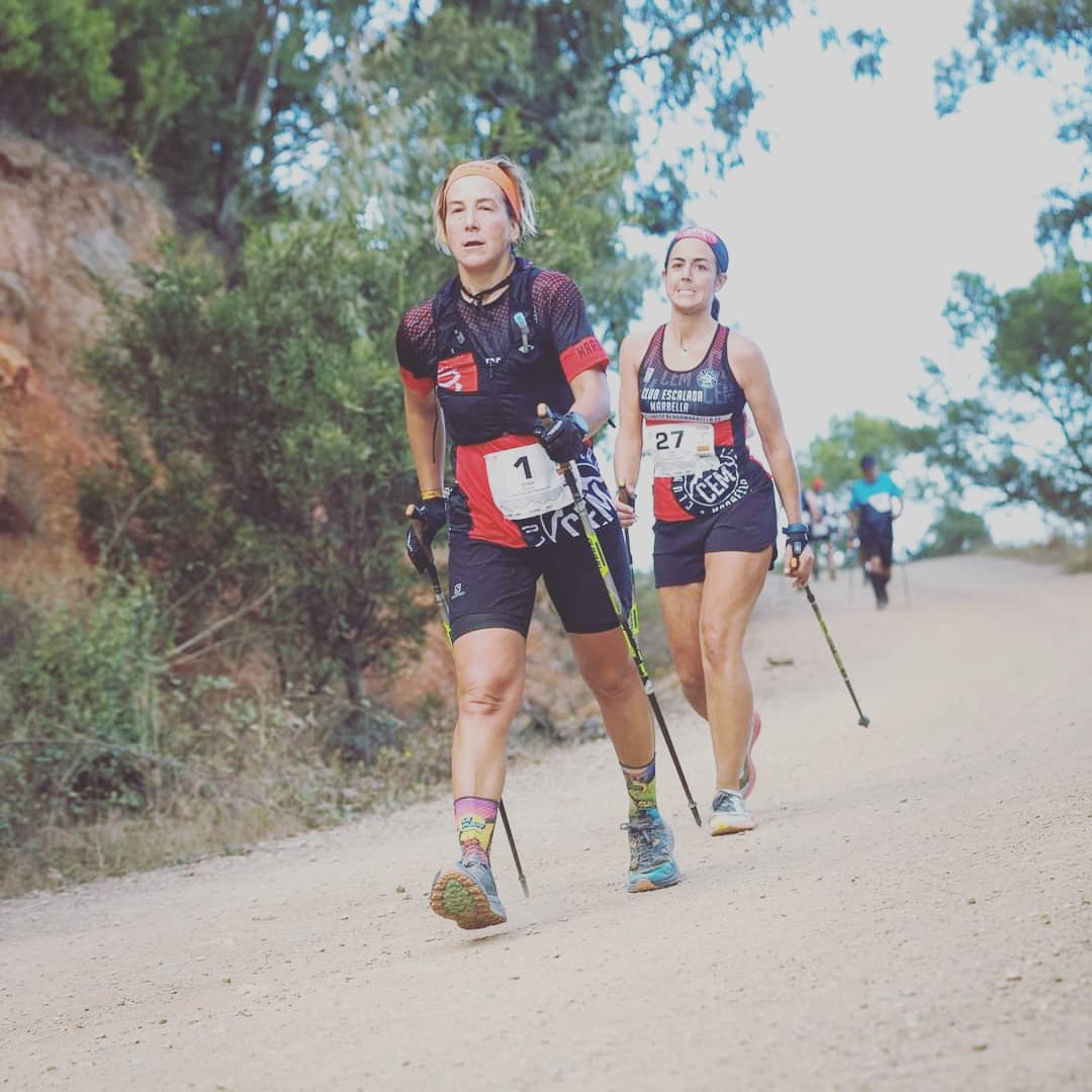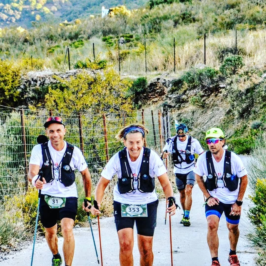 JAJAJAJA, Eso dicen: “maestra liendre, de todo sabe y de nada entiende”. Pues sí, las carreras por montaña son una de mis pasiones, sobre todo las de ultra-distancia. Como empecé a patear montaña, ya desde los quince años, y no antes porque no me dejaban ir sola y nadie quería venir en aquella época conmigo, pues mientras caminaba, a veces, pues corría, bajaba corriendo, subía e incluso cuando me cansaba, me echaba a dormir en una piedra, jajaja. Es por eso, mi pasión son las ultras porque mientras más tiempo esté en la montaña, más feliz soy. Compaginaba carreras por montaña de cualquier distancia, cuando empezaron a salir las copas provinciales, La Liga Rondeña de Ultrafondo y algo más tarde con la Marcha Nórdica, cuando nuestra presidenta del club Escalada Marbella, María Maestro, nos impartió el curso y nos metió ese venenillo. No se me daba mal, decían tenía potencial, jejeje. Potencial de cabrilla. Unos cuatro años compaginando ambas competiciones, incluyendo con la Selección Andaluza de Marcha Nórdica, copas y campeonatos de España. Época preciosa y que ya a mi edad surgió como un regalo en mi vida.