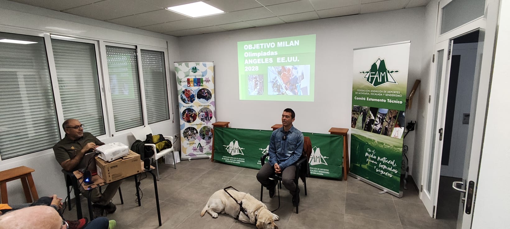 Durante la sesión de Javier Aguilar, el alcalde de Villanueva del Trabuco, Juan Luis Gallardo Bolaños, se sumó al encuentro, escuchó parte de la charla de Javier Aguilar y dirigió unas palabras de bienvenida y reconocimiento a todos los participantes. Agradeció el trabajo de la FADMES y de la FAM en la promoción del deporte inclusivo, felicitó a Javier por sus logros y ofreció el apoyo del municipio para acoger futuros encuentros, recordando que “Villanueva del Trabuco tiene las puertas abiertas a la familia montañera”.