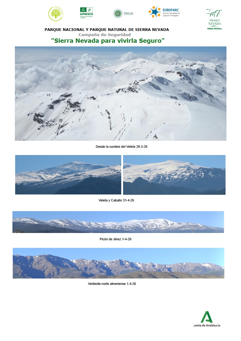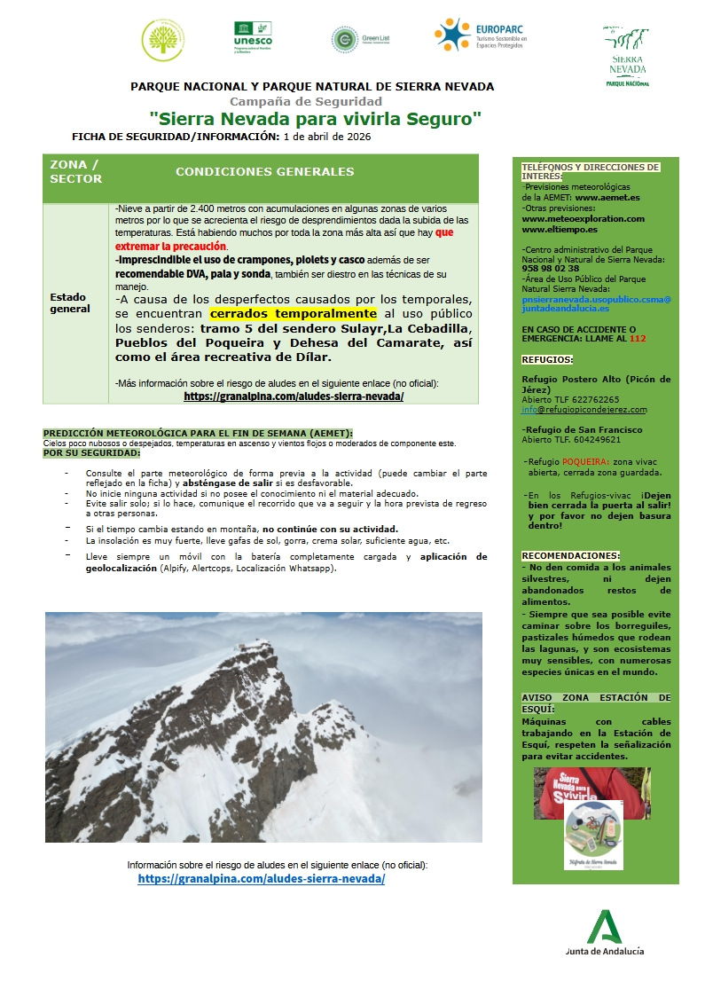 El Parque Nacional y Natural de Sierra Nevada en su ficha de seguridad semanal remitida a la FADMES informa que hay nieve a partir de los 2.400 metros con mucha acumulación de varios metros en diferentes zonas por lo que se insiste en EXTREMAR LA PRECAUCIÓN ya que se han incrementado los desprendimientos debido a la subida de las temperaturas. Es imprescindible, además, el uso de crampones, piolets y casco, además de recomendable DVA, pala y sonda, y ser diestro en las técnicas de manejo.