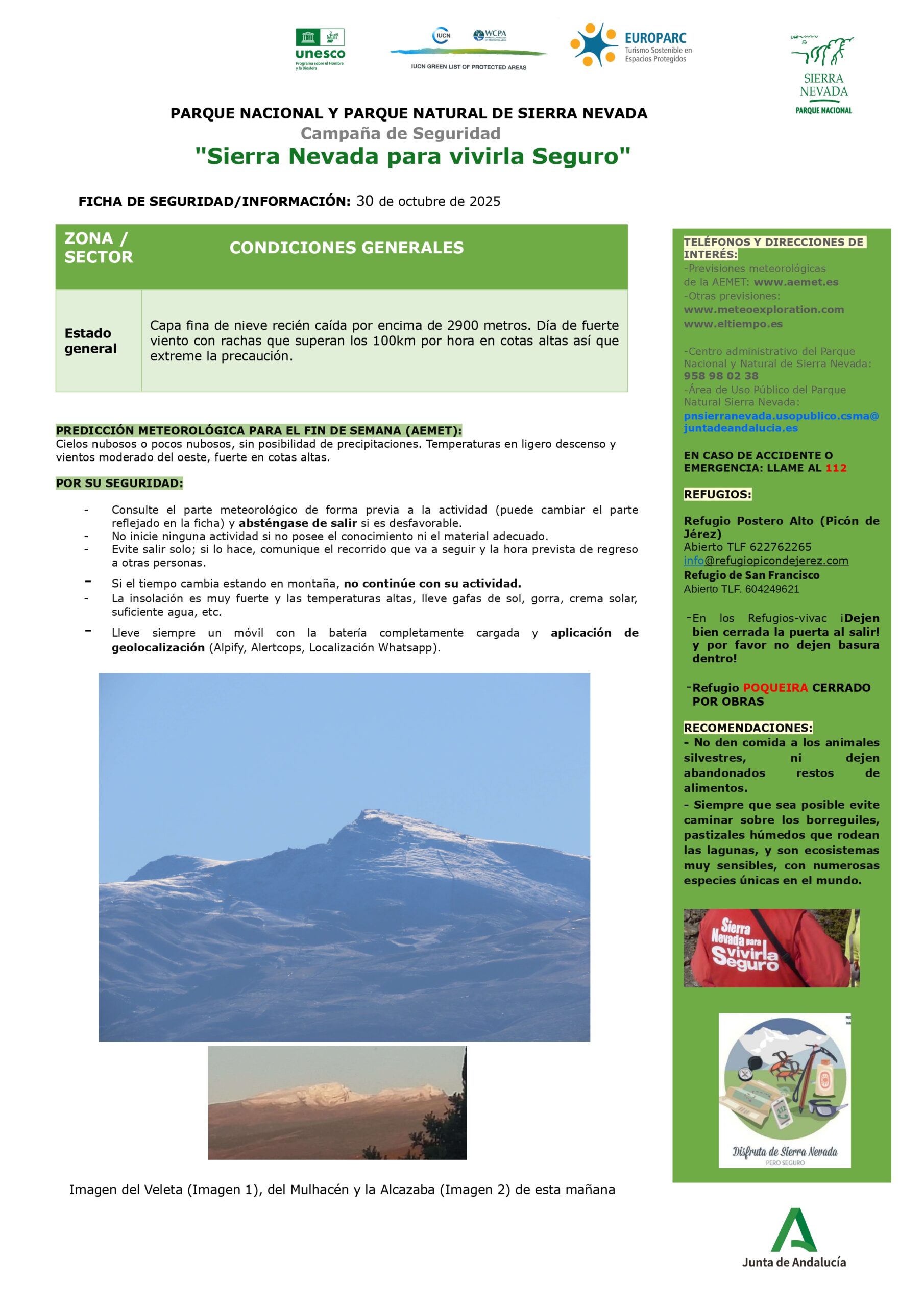 El Parque Nacional y Natural de Sierra Nevada en su ficha de seguridad semanal remitida a la FADMES informa que hay una capa fina de nieve recién caída por encima de los 2900 metros. Día de fuerte viento con rachas que superan los 100 km por hora. Por favor, extremar la precaución.
