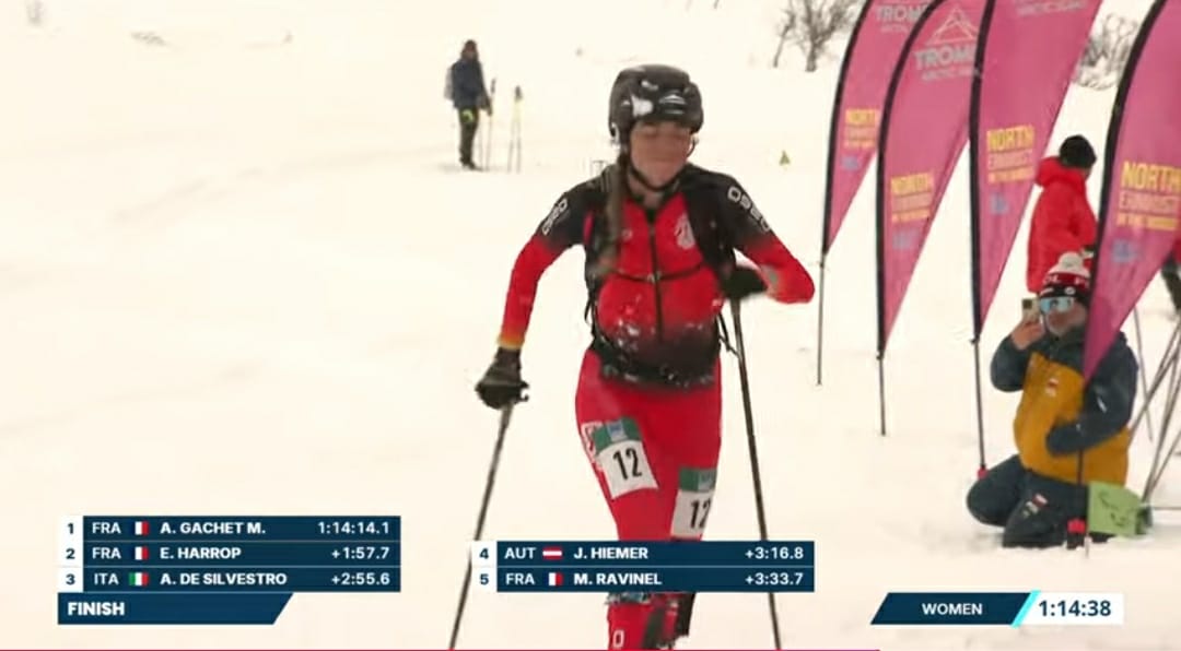 La meteorología volvía a traer precipitaciones en forma de nieve conforme se iba alcanzaando las cotas más altas, como en la segunda cota, con tranisión a 967 metros en la que Gachet mantenía la primera plaza con una renta de algo más de un minuto sobre Emily Harrop, antes de un rapidísimo descenso para colocar de nuevo pieles. En ese punto An Alonso, Alba de Silvestre y Hiemer llegaban por ese orden juntas a más de 3 minutos. De nuevo transición rápido, descenso adquiriendo de nuevo una mínima renta con la italiana para de nuevo ascender en tercera posición hasta la tercera y última cota antes de iniciar el definitivo descenso hasta la meta, y con la opción de obtener la segunda plaza en la Overall de la Copa del Mundo. Si ella quedaba tercera y Celia Perillat undécima la superaba en el ranking final.