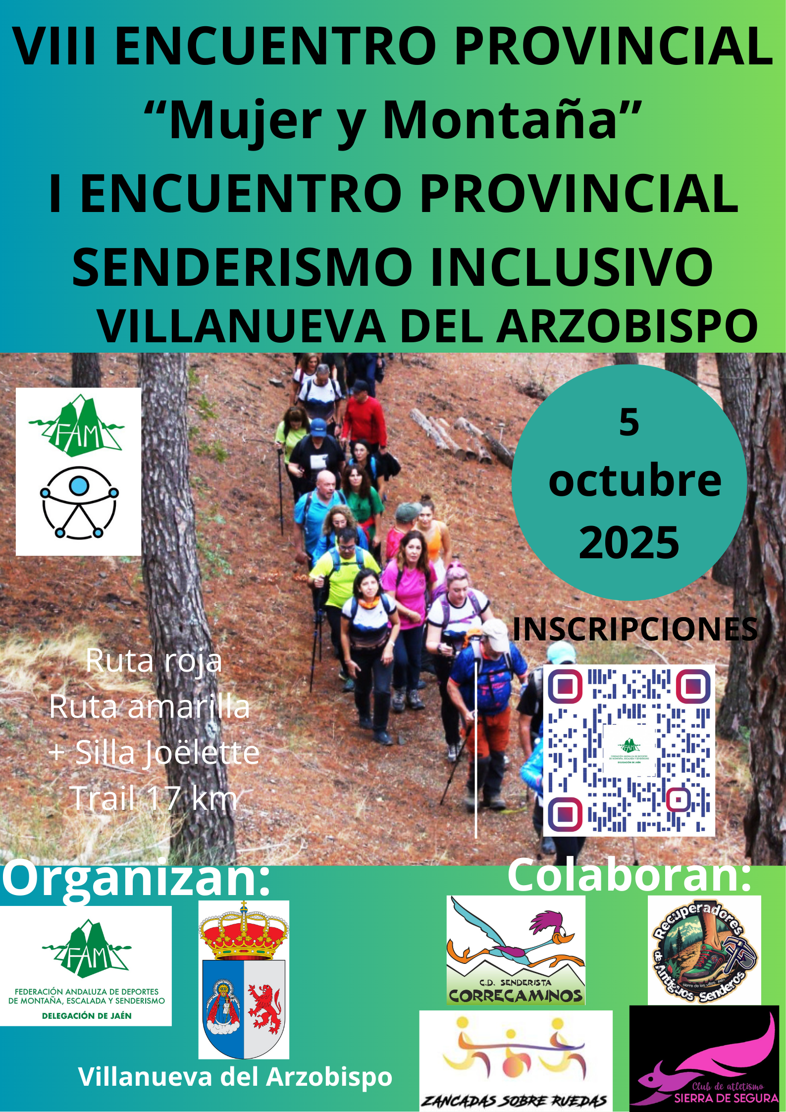 La Delegación de Jaén de la FADMES, a través de la Vocalía de Mujer y Montaña, las Áreas de Montañismo Inclusivo y de Igualdad de la FADMES y el Ayuntamiento de Villanueva del Arzobispo, organizan, con la colaboración de Club de Senderismo Correcaminos de Villanueva del Arzobispo, la Asociación Zancadas sobre ruedas (Delegación de Siles), Recuperadores de antiguos senderos, el Club de Atletismo Sierra de Segura y Protección civil, el VIII ENCUENTRO PROVINCIAL “Mujer y Montaña” y el I ENCUENTRO PROVINCIAL DE SENDERISMO INCLUSIVO en la provincia de Jaén, el día 5 de octubre en el municipio de Villanueva del Arzobispo.