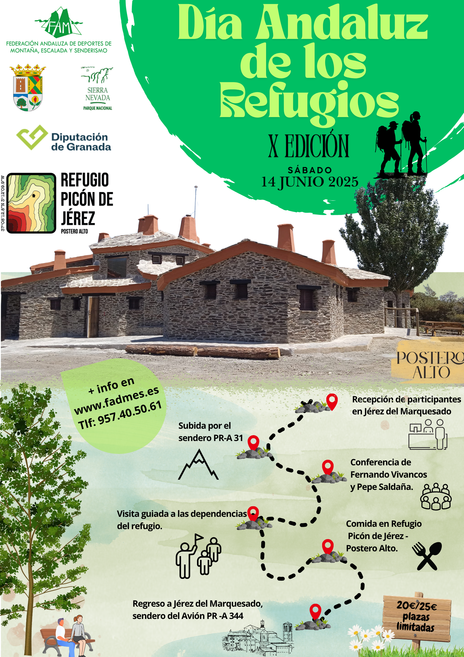 La Federación Andaluza de Deportes de Montaña, Escalada y Senderismo, a través del Área de Infraestructuras, organiza este sábado 14 de junio la décima edición del Día Andaluz de los Refugios, conjuntamente con el Ayuntamiento de Jérez del Marquesado y el Refugio Picón de Jérez–Postero Alto. Un evento que va a reunir a medio centenar de personas entre participantes, técnicos y organización.