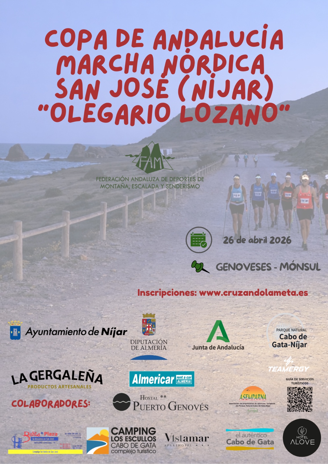 La Copa de Andalucía de Marcha Nórdica regresa este año a Almería y se celebrará el próximo 26 de abril de 2026 en San José, Níjar, en pleno corazón del Parque Natural de Cabo de Gata-Níjar. En esta segunda prueba de la Copa de Andalucía, organizada por la Delegación Almeriense de la Federación Andaluza de Deportes de Montaña, Escalada y Senderismo (FAM), los participantes podrán disfrutar de un recorrido único de 2.800 metros (ida), que transcurre desde Playa de los Genoveses hasta Playa de Mónsul, combinando deporte, aire puro y vistas impresionantes en uno de los paisajes más emblemáticos de Andalucía.