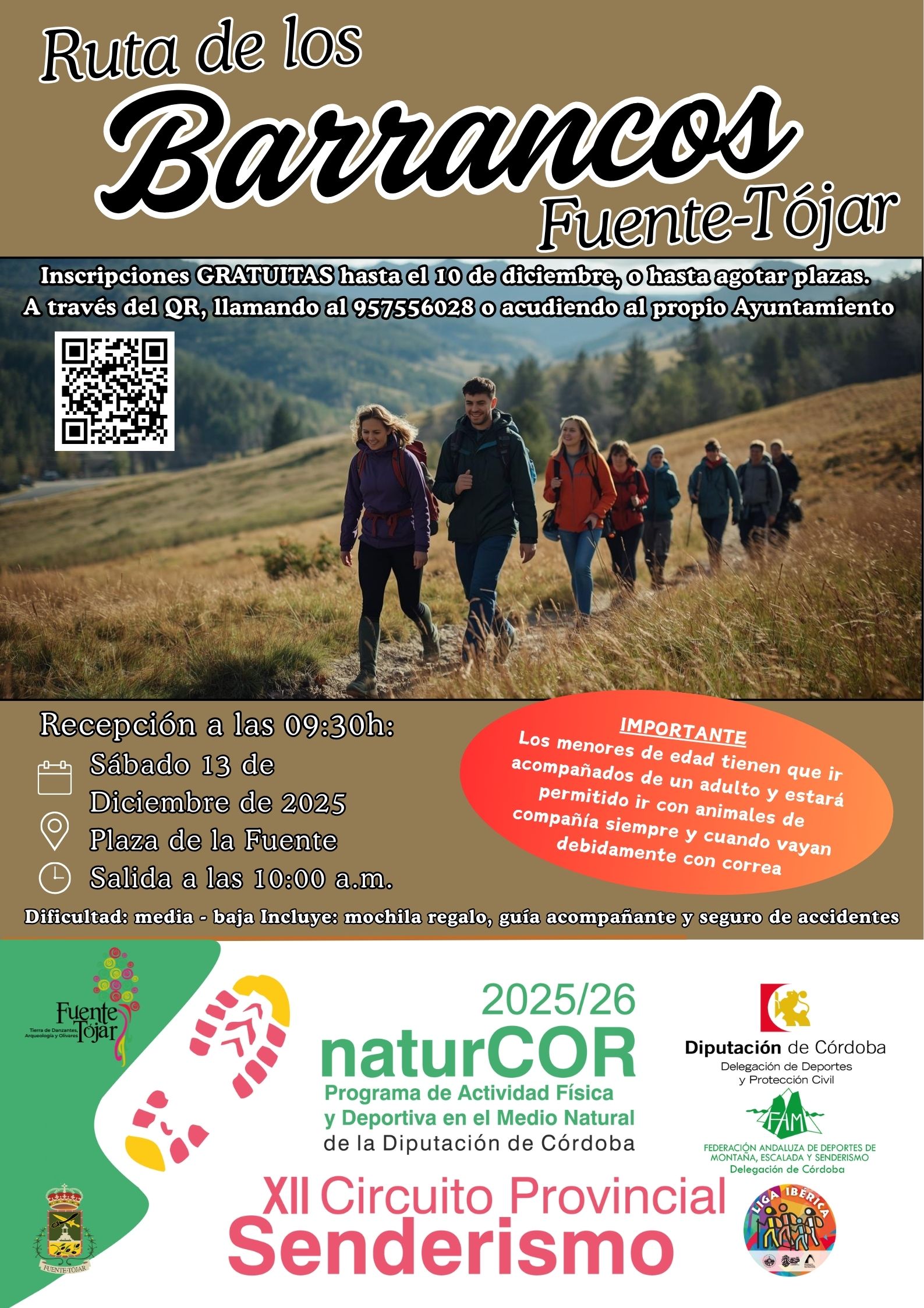 El sábado 13 de diciembre, dentro del XII Circuito Provincial de Senderismo del programa de actividades física y deportivas en el medio natural naturCOR, promovido por la de la Diputación de Córdoba junto con la Federación Andaluza de Deportes de Montaña, Escalada y Senderismo (FADMES), con la organización por el Ayuntamiento de Fuente Tójar, se celebrará la decimotercera y última prueba de esta edición de 2025.