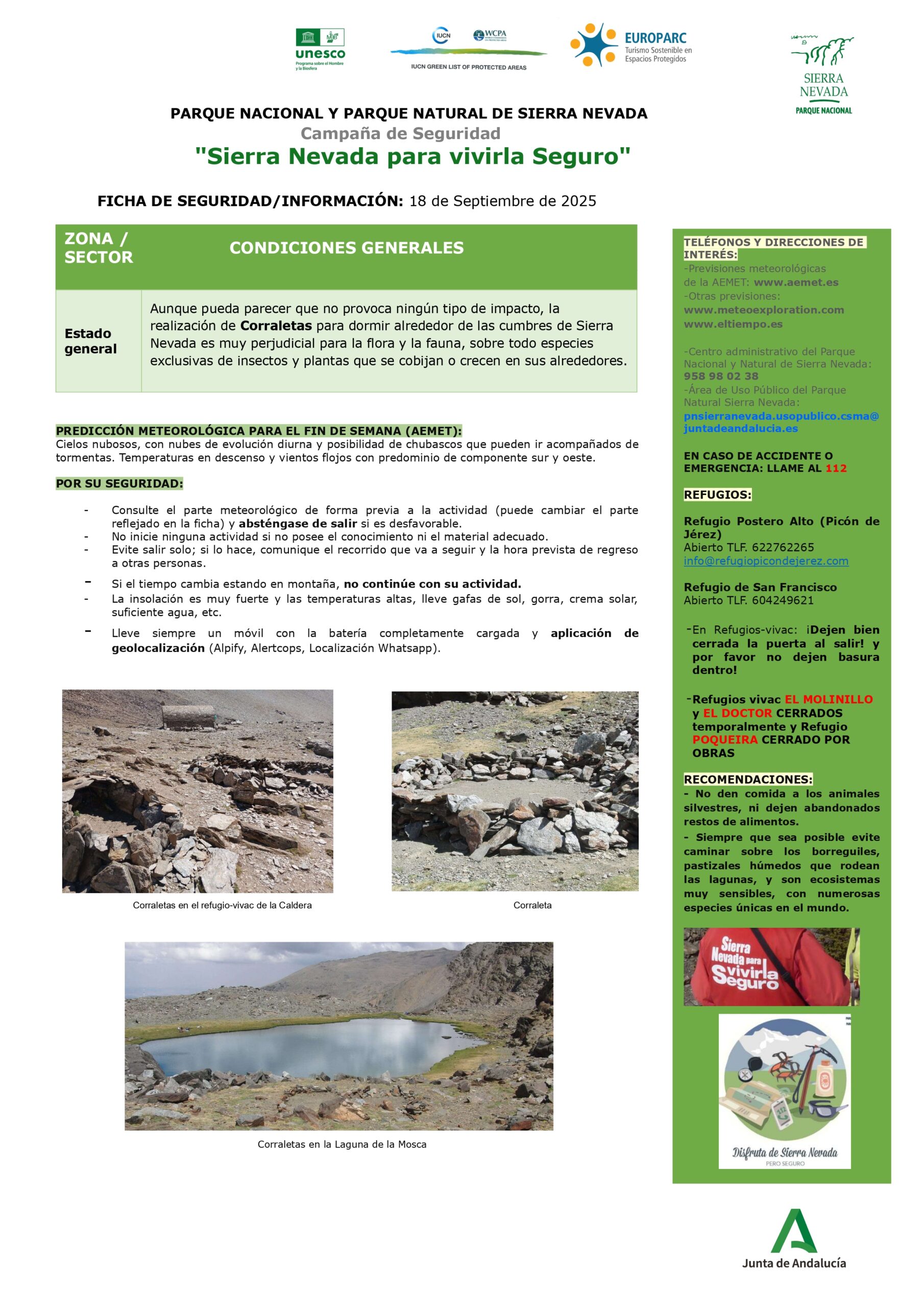 El Parque Nacional y Natural de Sierra Nevada en su ficha de seguridad semanal remitida a la FADMES informa que “aunque puede parecer que no provoca ningún impacto, la realización de Corraletas para dormir alrededor de las cumbres de Sierra Nevada es muy perjudicial para la flora y fauna, sobre todo especies exclusivas de insectos y plantas que se cobijan o crecen en sus alrededores”. De ahí que ruegue no realizarlas.