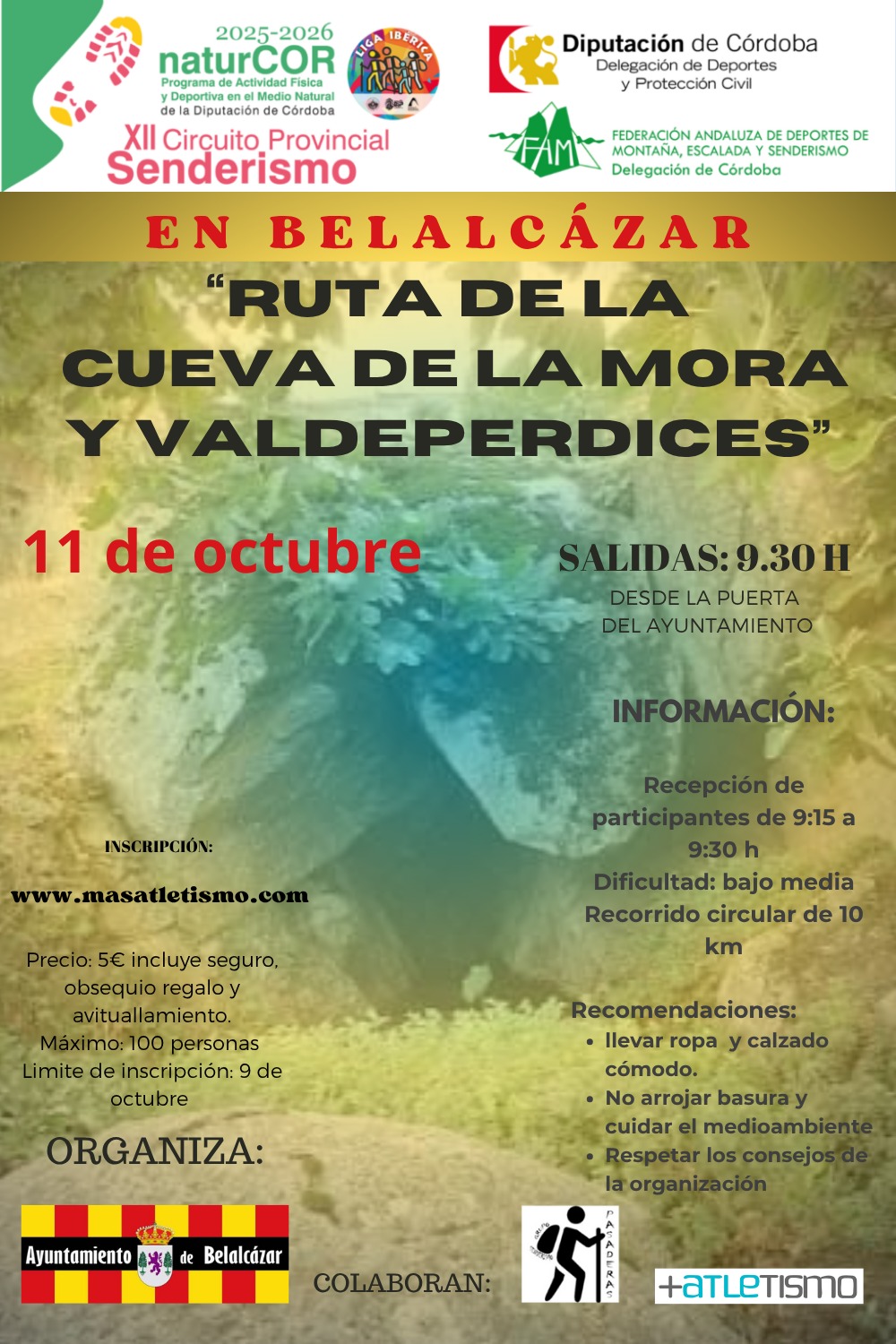 El sábado 11 de octubre, dentro del XII Circuito Provincial de Senderismo del programa de actividades física y deportivas en el medio natural naturCOR, promovido por la de la Diputación de Córdoba junto con la Federación Andaluza de Deportes de Montaña, Escalada y Senderismo y la organización por el Ayto de Belalcázar se celebrará la octava prueba de esta duodécima edición. En esta ocasión en el municipio de Belalcázar, se trata de la “Ruta de la Cueva de la Mora a Valdeperdices”, en la comarca de Los Pedroches, de Córdoba.
