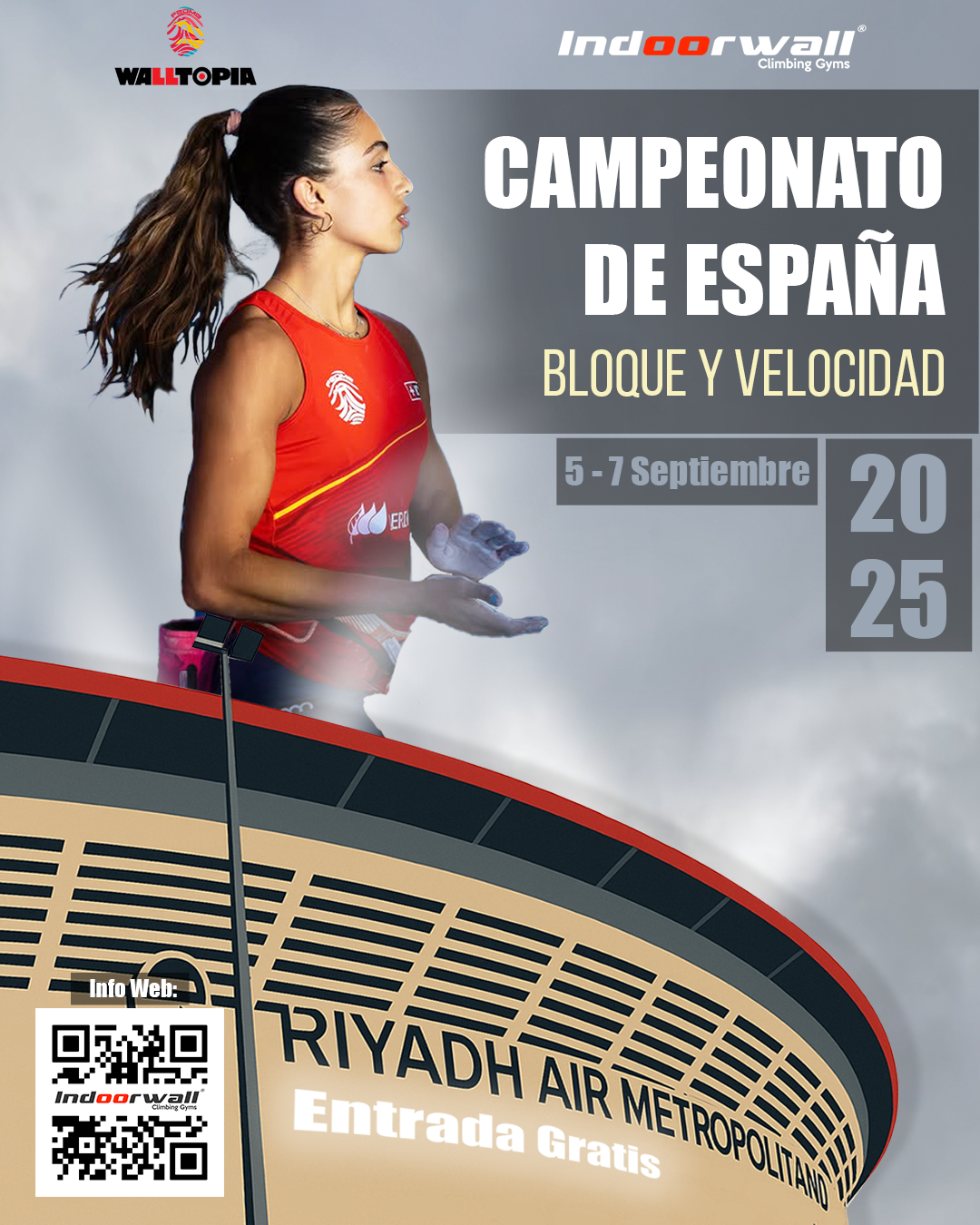 El estadio de fútbol Riyadh Air Metropolitano del Atlético de Madrid va a ser el escenario en el que se va a celebrar desde esta tarde 5, sábado 6 y domingo 7 de septiembre el Campeonato de España de Escalada de Velocidad y Bloque. Un lugar insólito y la primera vez que un estadio de tal magnitud alberga un evento de Escalada. Un escenario espectacular e icónico en el que competirán los y las mejores escaladores y escaladoras de España y acceso gratuito para el público.