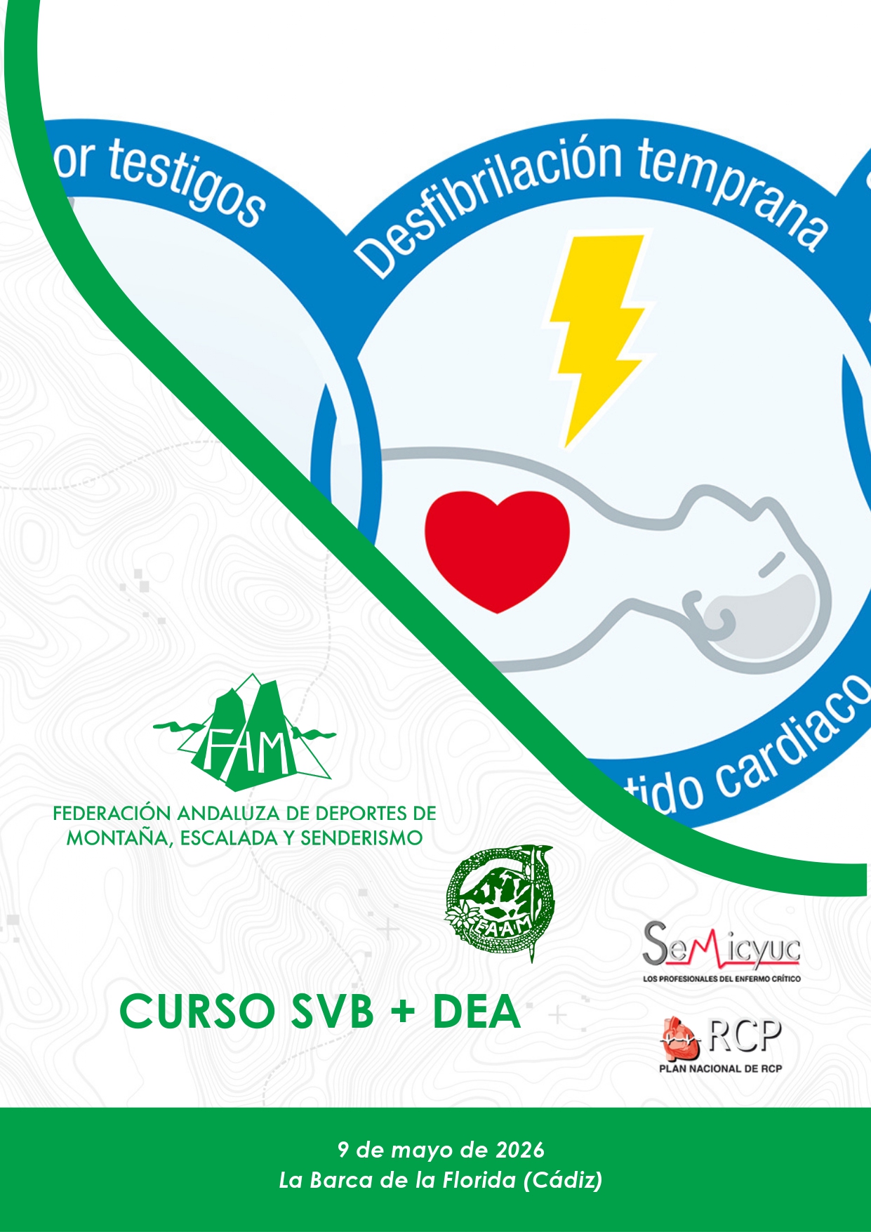 La Federación Andaluza de Deportes de Montaña, Escalada y Senderismo, a través de la Escuela Andaluza de Alta Montaña (EAAM), organiza para el próximo 9 de mayo un Curso de Soporte Vital Básico en Montaña + DEA. El mismo se desarrollará en La Barca de la Florida (Cádiz).