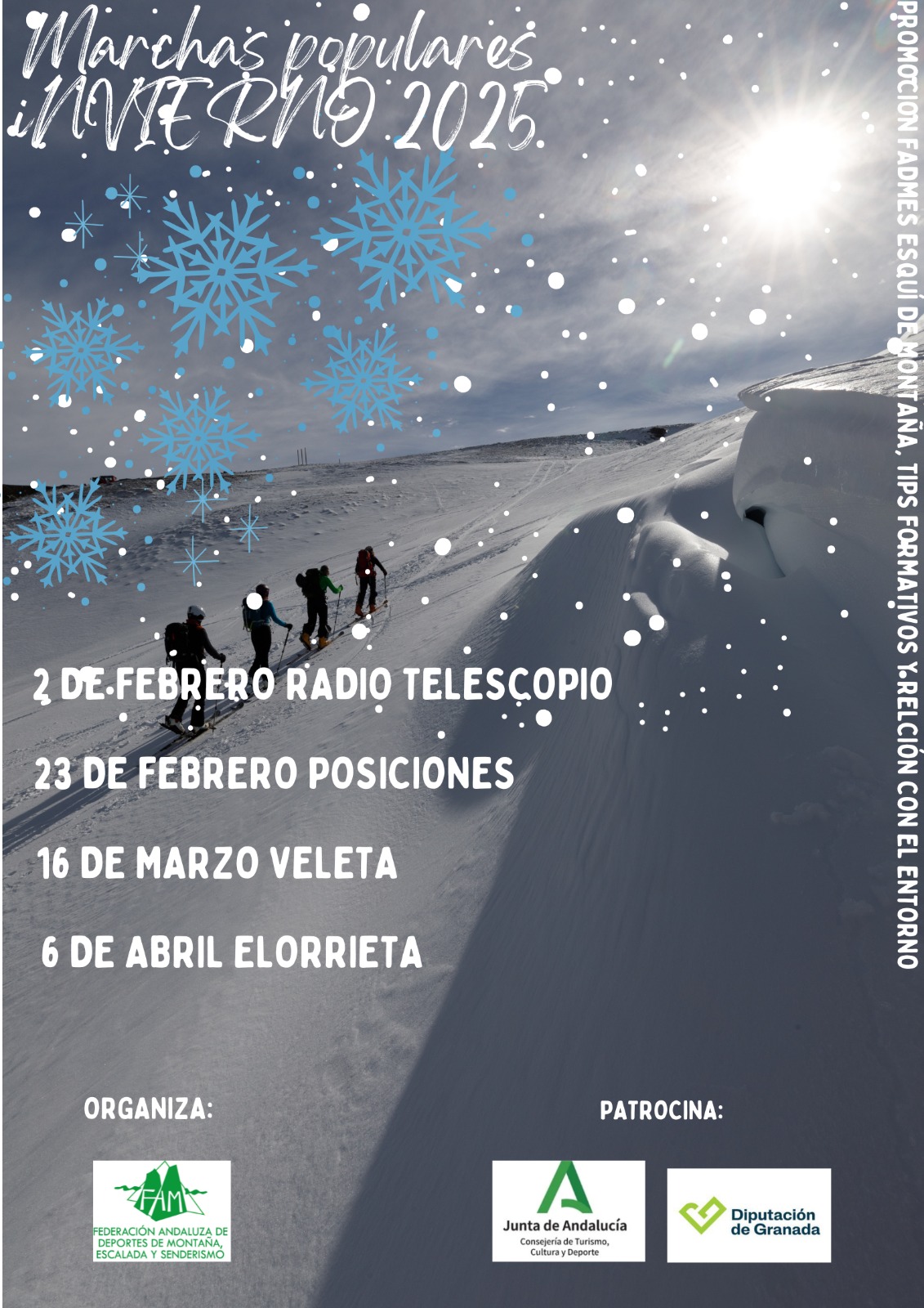 Las marchas populares organizadas y promovidas por la Federación Andaluza de Deportes de Montaña, Escalada y Senderismo están pensadas para realizarse en su totalidad, a pesar que se admiten inscripciones aleatorias, pues están orientadas a la promoción de este deporte y del Parque Nacional de Sierra Nevada, así como a garantizar la seguridad y la autonomía en nuestras salidas invernales con esquís de montaña. De esta forma, se pretende fomentar el esquí de montaña desde la base, la cultura de montaña, el conocimiento y el respeto a las montañas.