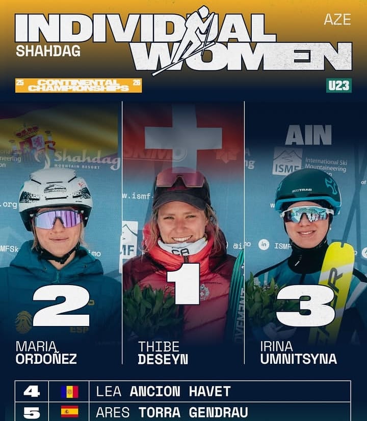 La prueba Individual de los Campeonatos de Europa de Esquí de Montaña que se ha celebrado hoy en la estación de Shahdag (AZE) ha supuesto la primera medalla para la esquiadora andaluza María Ordóñez Cobacho (CD Boreá). Ha logrado la plata y el subcampeonato en U23 en una jornada con una meteorología totalmente diferente a la de las jornadas anteriores. Hoy sol y brillo de María Ordóñez (1:51:27), quien ha sido solo superada en su subcategoría por la suiza Thibe Deseyn (1:40:13), mientras que Irina Umnitsyna (ANY, 1:51:58) ha sido la tercera clasificada.