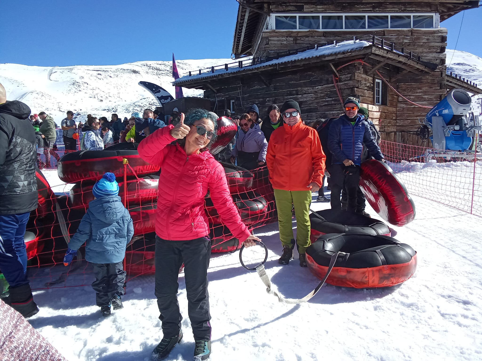 Una vez llegado el grupo a la Estación de Esquí y a través del Telecabina Al Andalus se ascendió hasta la zona de Borreguiles (2.700 mts.) donde el grupo disfrutó de un agradable tiempo de recreación en la nieve en la zona que CETURSA-Sierra Nevada tiene para ello, deslizándose con roscos y trineos por los toboganes de nieve.