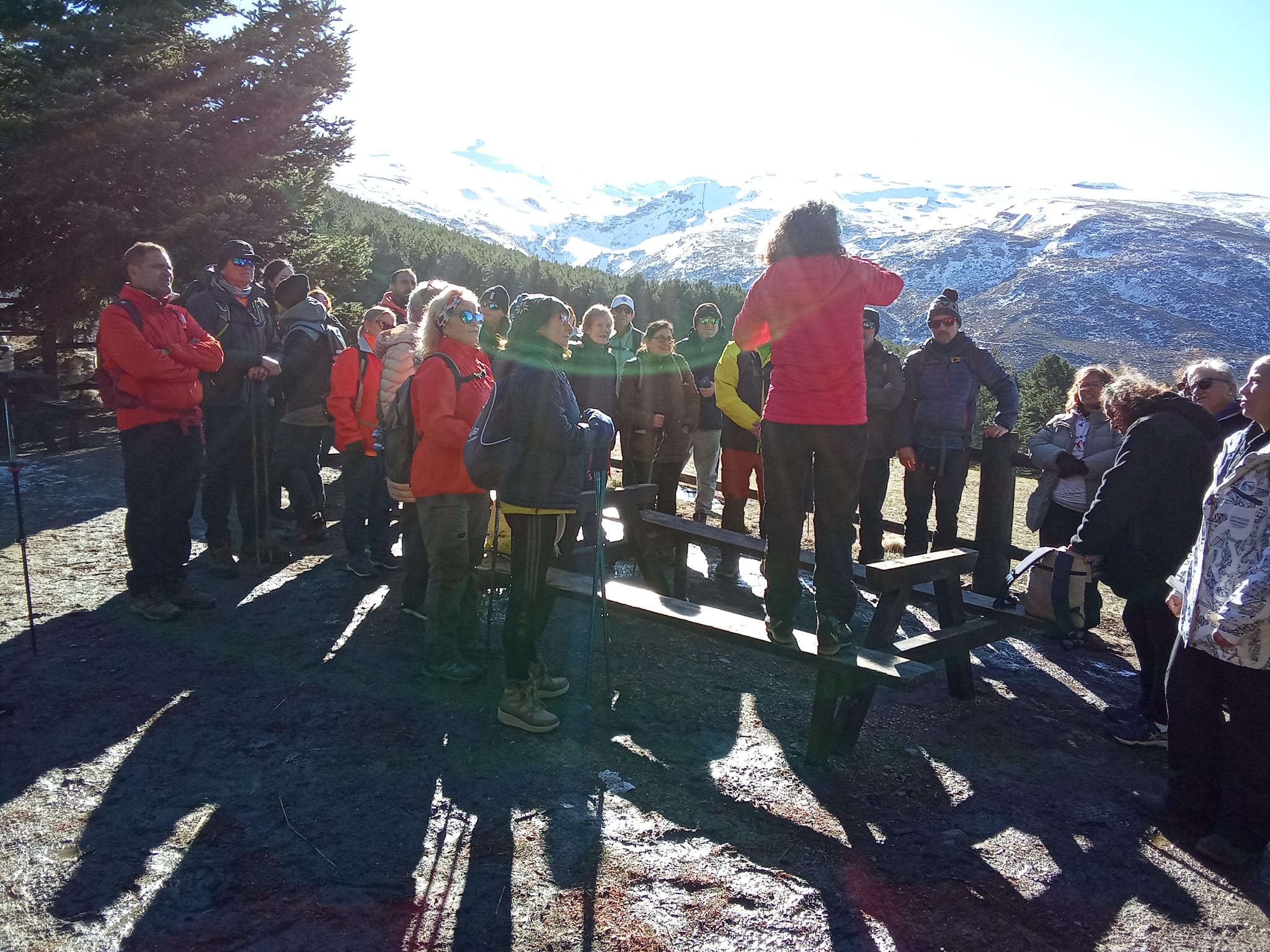 A las 10:00 horas el grupo partió en bus hacia Sierra Nevada, donde tendría lugar la tercera jornada de este encuentro. Este día comenzaría en el bonito paraje de La Suerte de Fuente Alta, en Pradollano, antiguo cortijo donde a primeros del siglo XX las familias de los pueblos cercanos pasaban el verano con actividades agrícolas y ganaderas, para aprovechar el buen tiempo del estío y así generar recursos económicos y materiales para las economías familiares de la época.