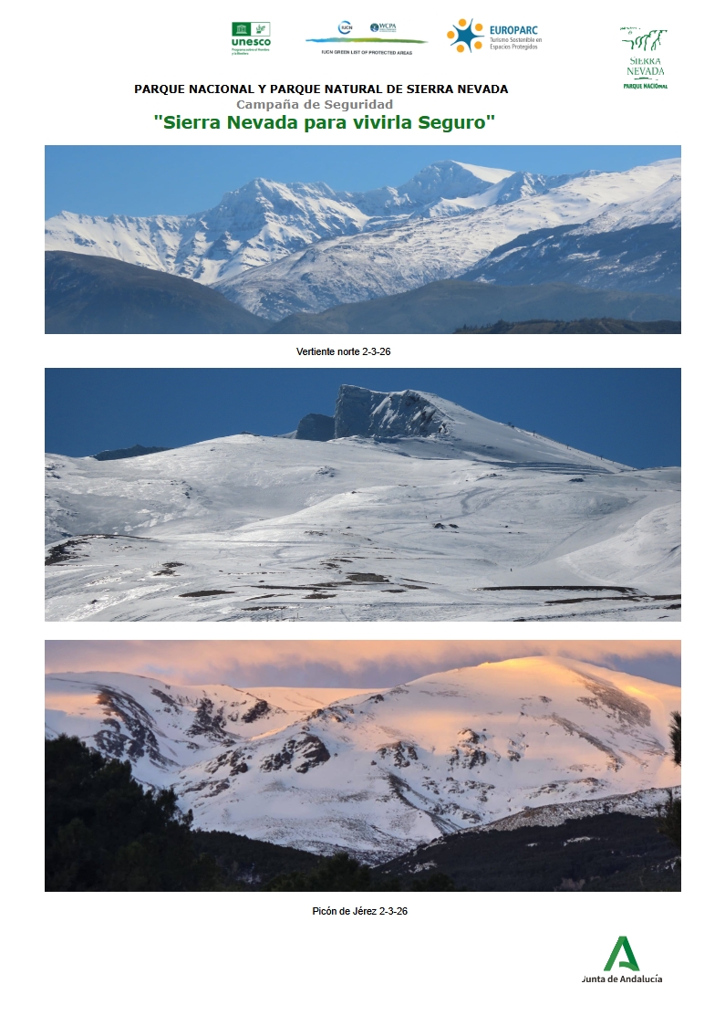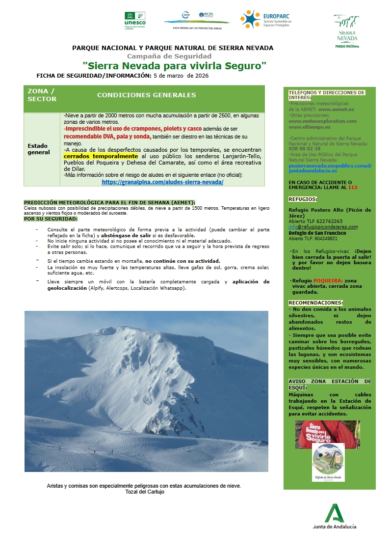 El Parque Nacional y Natural de Sierra Nevada en su ficha de seguridad semanal remitida a la FADMES informa que hay nieve a partir de los 2.000 metros y mucha nieve acumulada desde los 2.500 metros, siendo de algunos metros en diferentes zonas. Por ello es imprescindible el uso de crampones, piolets y casco, además de recomendable DVA, pala y sonda, y ser diestro en las técnicas de manejo.
