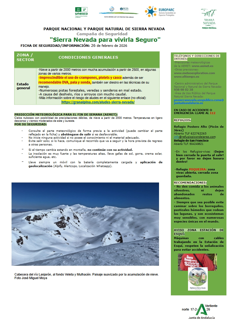 El Parque Nacional y Natural de Sierra Nevada en su ficha de seguridad semanal remitida a la FADMES informa que hay nieve a partir de los 2.000 metros y mucha nieve acumulada desde los 2.500 metros. Por ello es imprescindible el uso de crampones, piolets y casco, además de recomendable DVA, pala y sonda.
