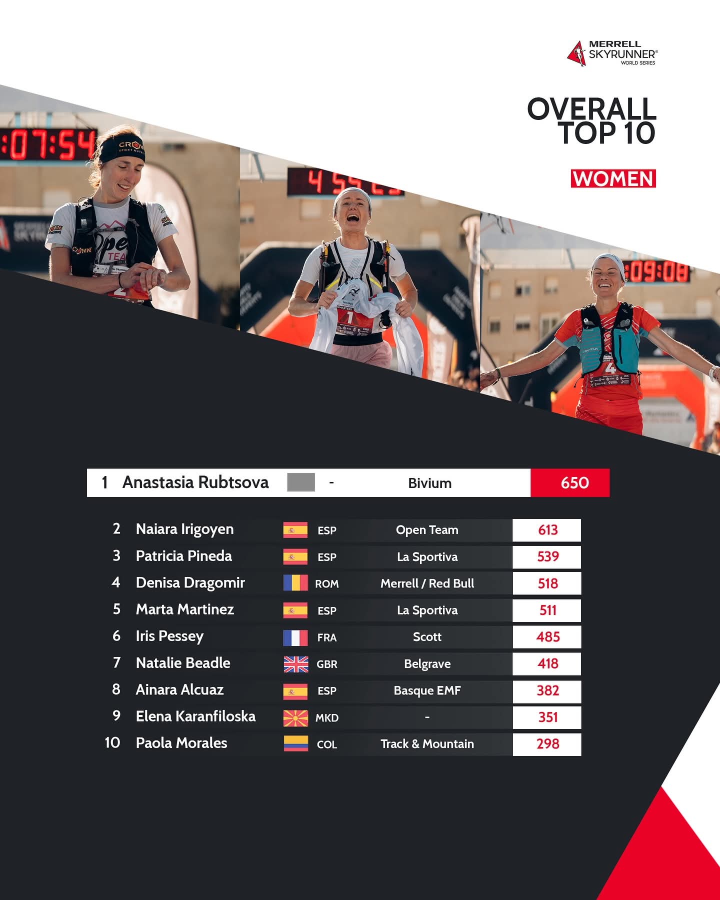 Patricia Pineda llegaba a esta última prueba como cuarta en la clasificación general y gracias a su más que meritorio tercera plaza en Castellón ha ascendido una posición para concluir en la tercera posición del podio final. Carrera en la que se ha impuesto Anastasia Rubtsova (4:55:25), seguida por Naiara Irigoyen (5:07:51) y la gaditana de La Sportiva Patricia Pineda (5:09:06)-