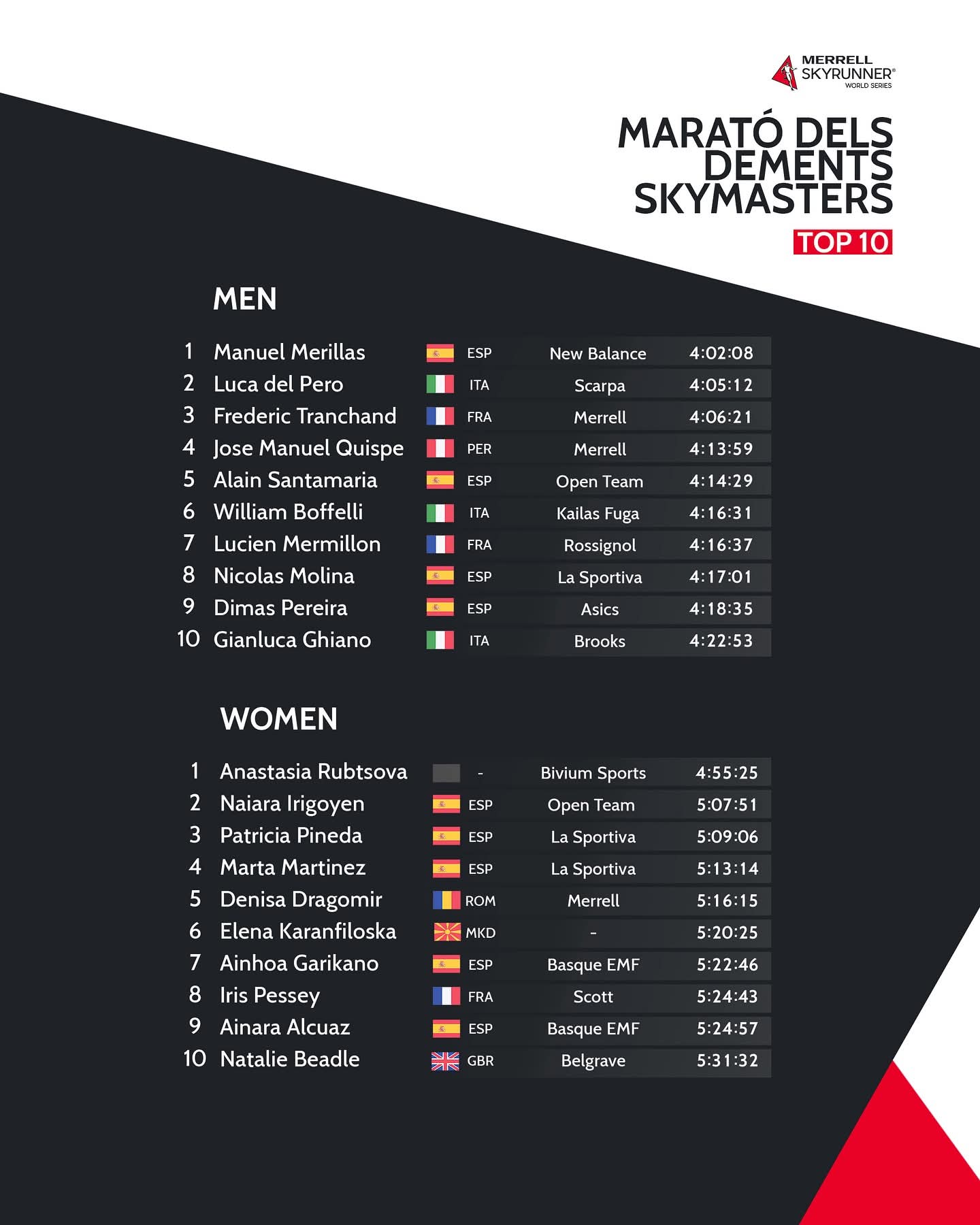 Nico Molina llegaba a esta última prueba en novena posición. Hoy ha sido octavo, lo que le ha permitido subir un puesto y certificar su posición en el TOP-10 de la general. Triunfo en la Dements para Manuel Merillas (4:02:08, seguido por Luca del Pero (4:05:12) y Frederic Tranchand (4:06:21). Nico Molina ha sido octavo con un tiempo de 4:17:01. El de La Sportiva y del Club de Montaña Cerro del Caballo vuelve a estar entre los mejores del mundo en a SkyMasters, de la que ya saboreó el triunfo final ediciones atrás.