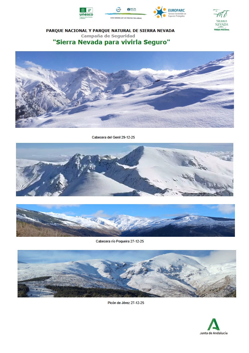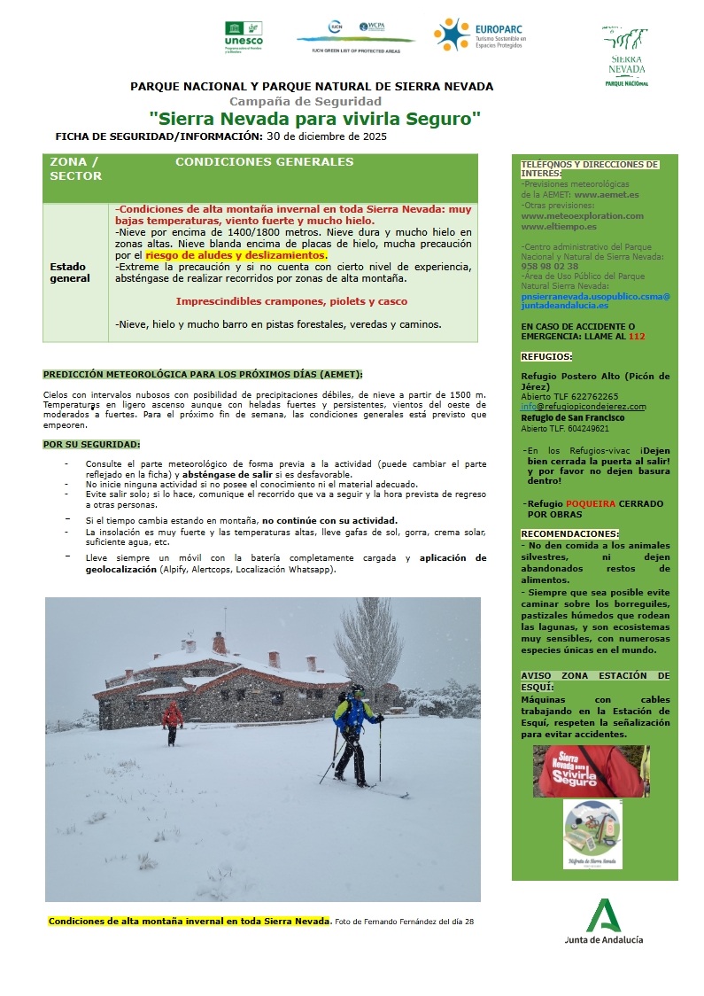 El Parque Nacional y Natural de Sierra Nevada en su ficha de seguridad semanal remitida a la FADMES informa que hay nieve por encima de los 1.400/1.800 metros, y que hay extremar la precaución al haber mucho hielo y nieve muy dura. “Está la sierra muy peligrosa”, advierte en su ficha de seguridad semanal. Es imprescindible el uso de crampones y piolets y el control de su manejo. “Las condiciones son de alta montaña invernal en toda Sierra Nevada: muy bajas temperaturas, viento fuerte y mucho hielo”, informa.