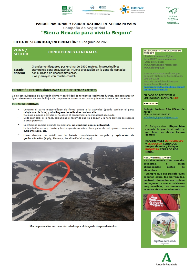 Advierte que hay que extremar la precaución en zonas de cortados por posibles desprendimientos y el uso imprescindible de crampones para cruzar los grandes ventisqueros que se encuentran en las cotas altas. Además, hay grandes caudales de agua en ríos y arroyos