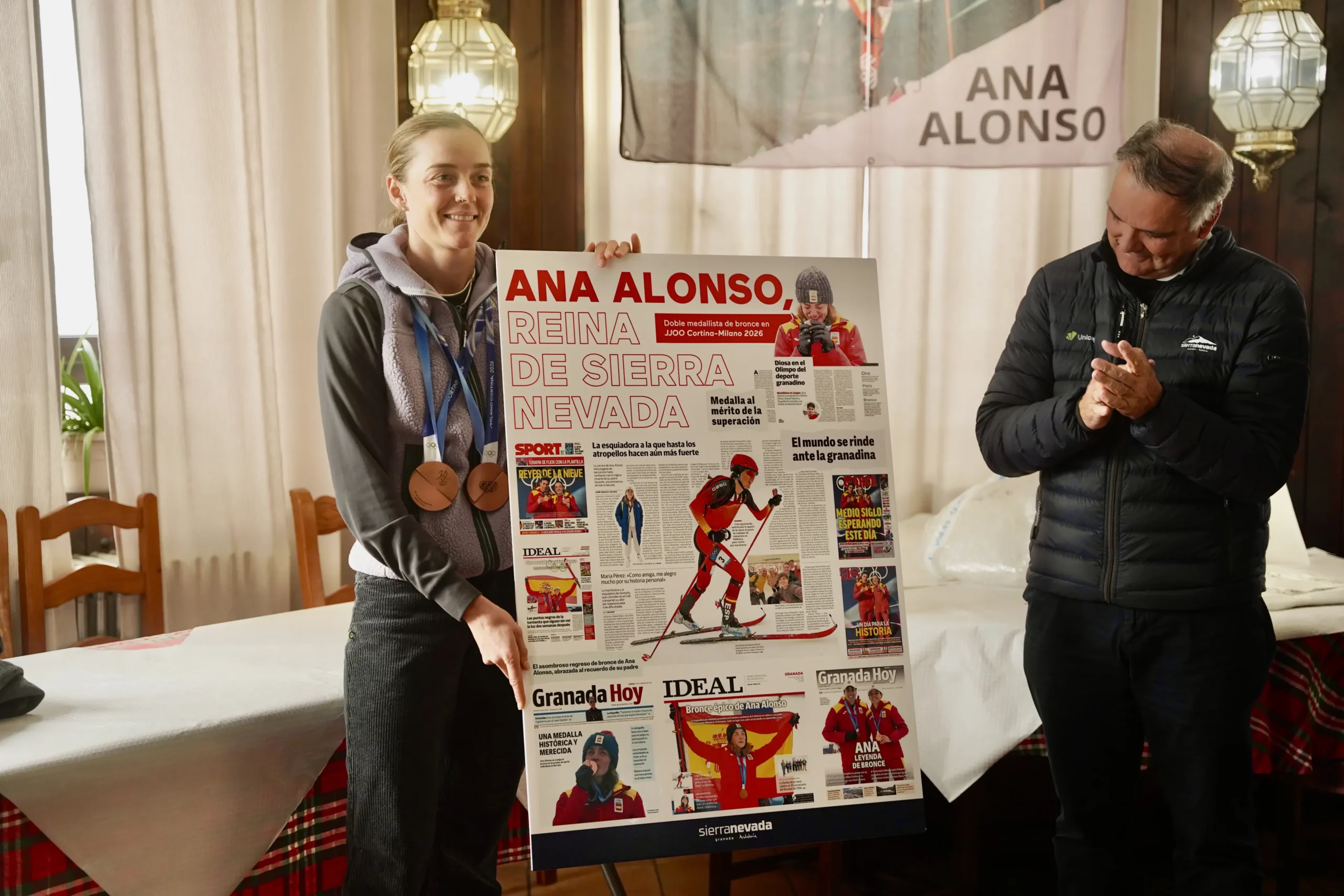 Y ha sido momento para que Cetursa Sierra Nevada anunciara que desde mañana el circuito de esquí de montaña de El Águila pasará a llamarse “Ana Alonso” y se será colocado esta semana en la estación inferior del telesilla Virgen de las Nieves, donde arranca el recorrido. Jesús Ibáñez entregó además a Ana Alonso un poster con las portadas de los periódicos españoles que recogieron su gesta en Cortina-Milán.